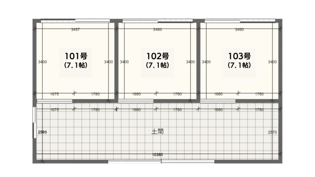 | 101 | 3.46m×3.4m(7.1帖) | ウォーターカップ | 空室 |