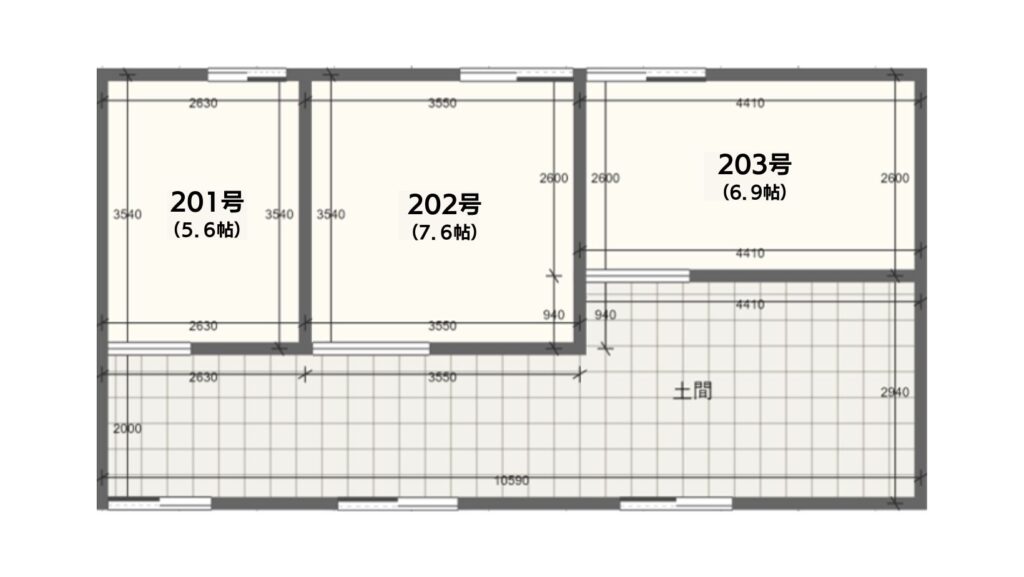 | 201 | 2.63m×3.54m(5.6帖) | ウォーターカップ | 満室 |